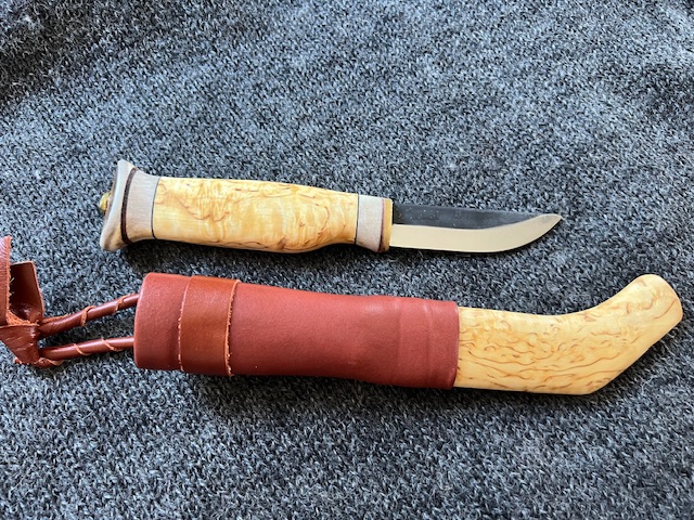 Bladet är i kolstål, cirka 7.5cm Hela kniven mäter cirkla 25 cm.